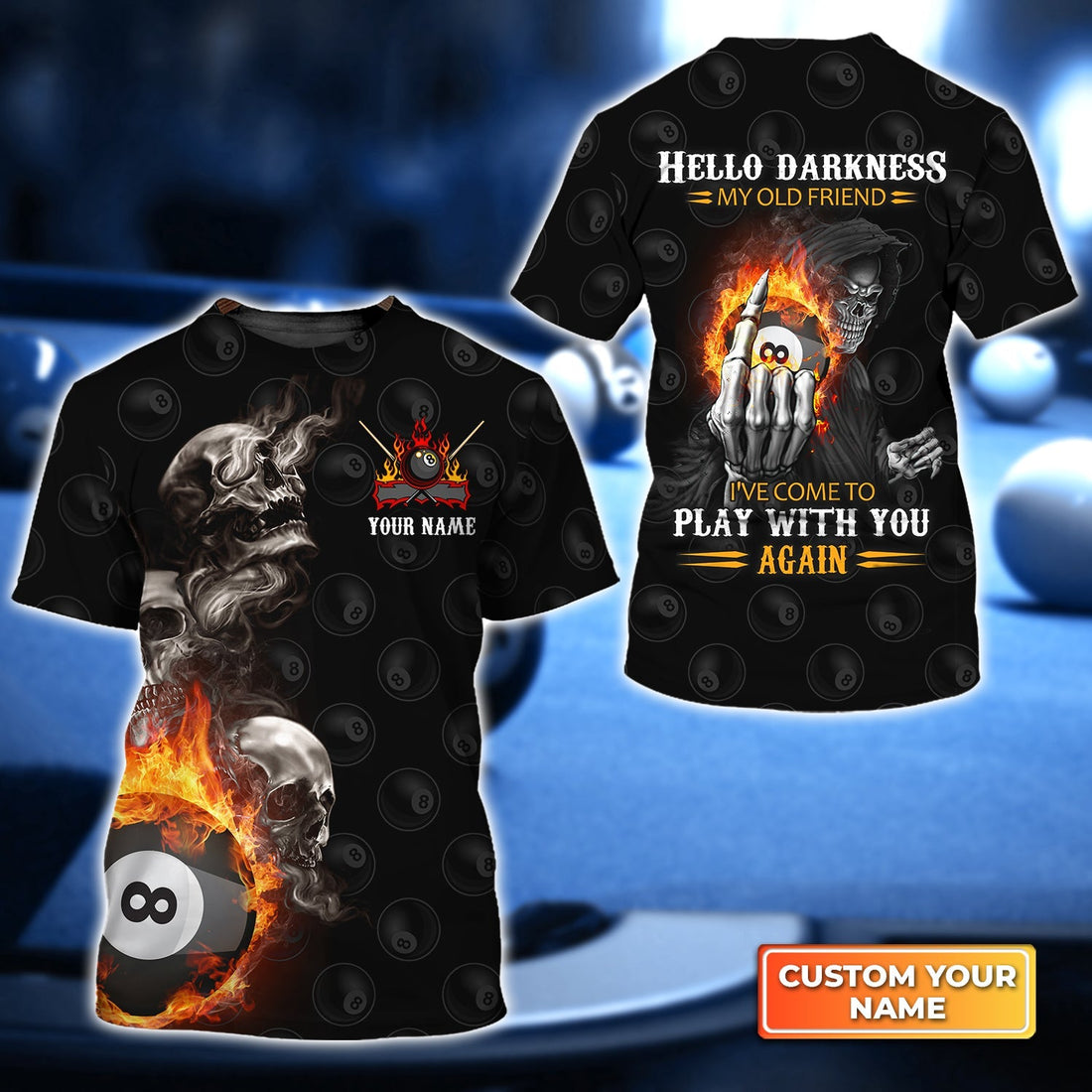 Skull Reaper Billiard Pool 8 Ball Hello Darkness My Old Friend Personalized Name 3D Tshirt Gift For Billiard Players