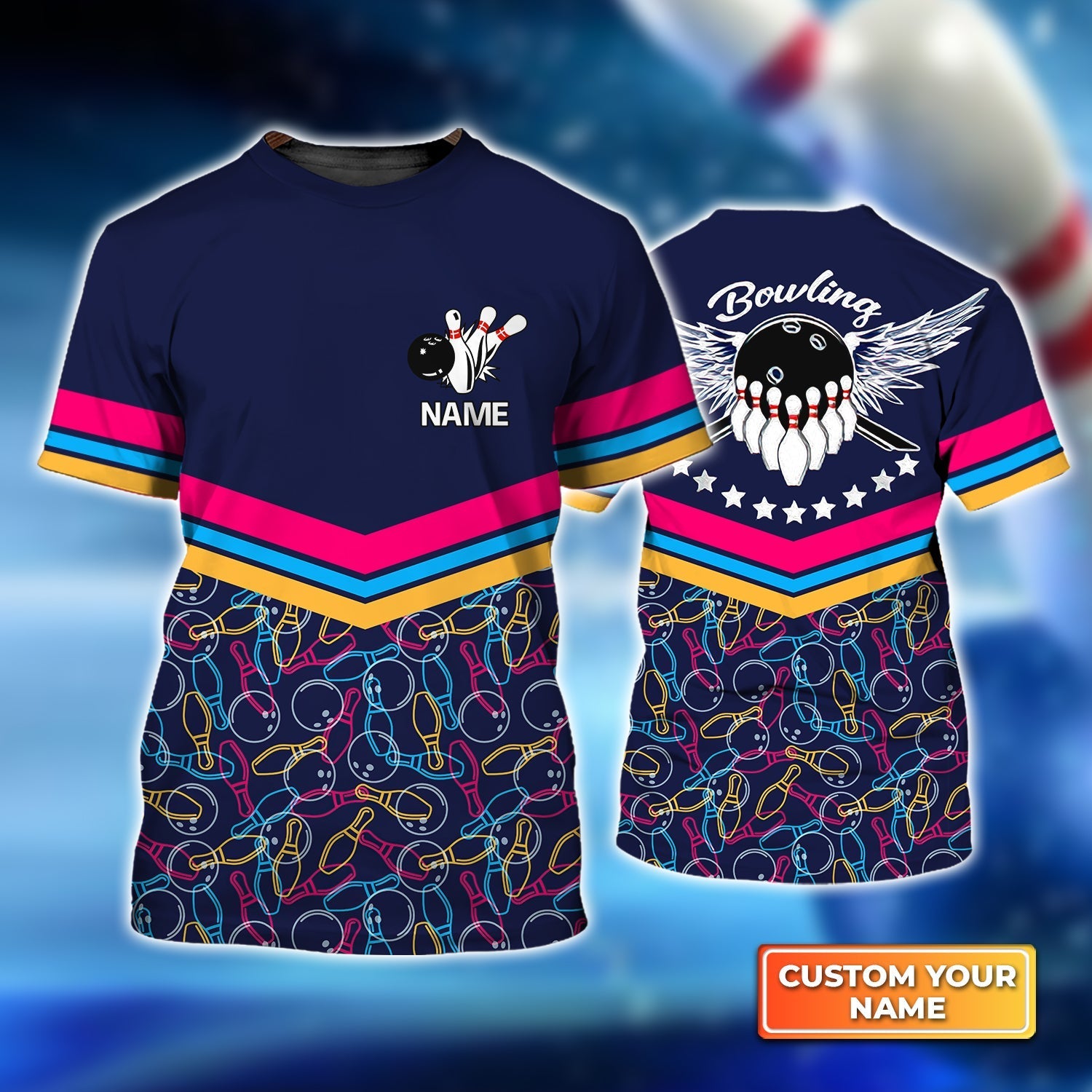 Color Linear Bowling Balls and Bowling Pins Personalized Name 3D Tshirt For Bowling Player