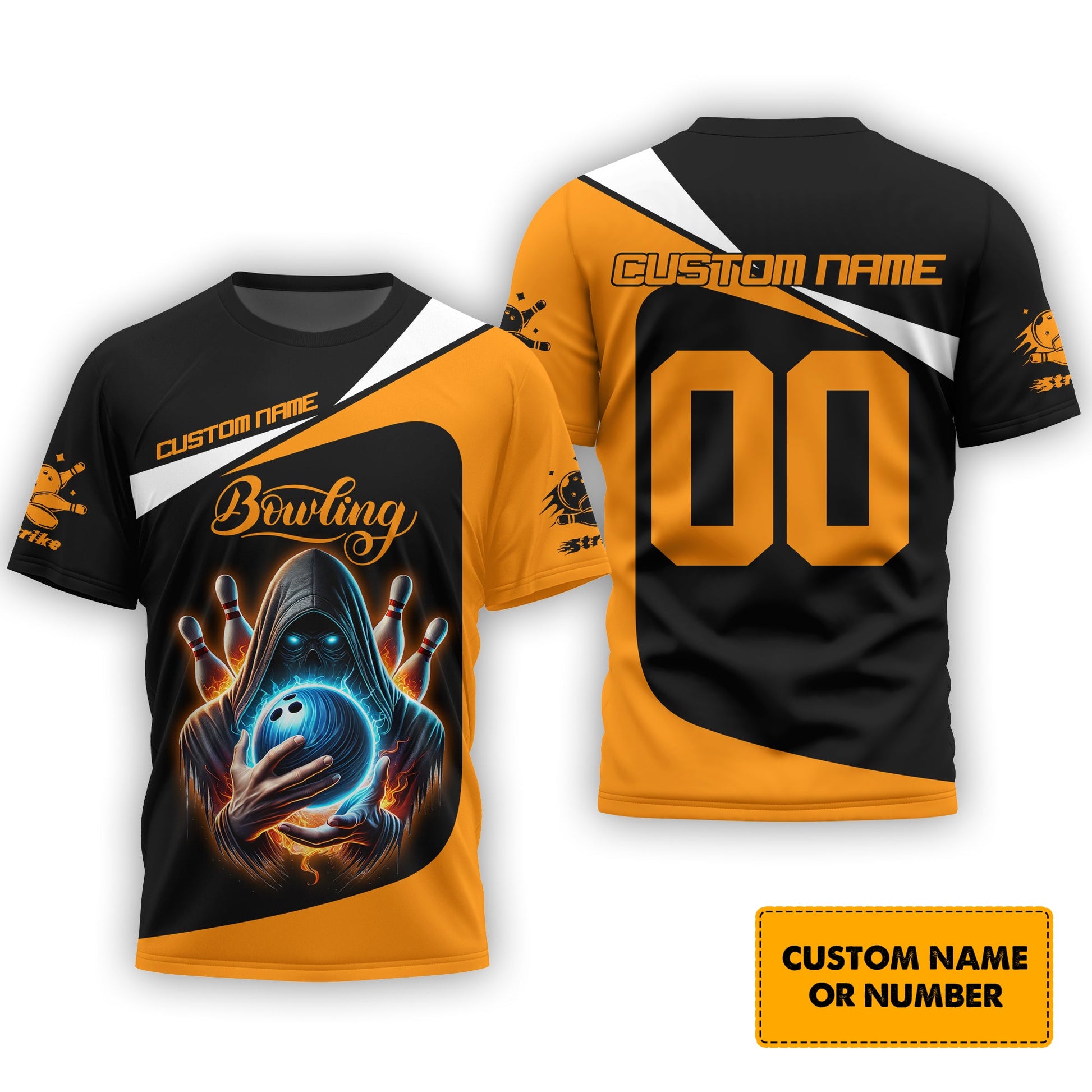 Custom Name & Number Orange Grim Reaper Bowling Personalized 3D Polo Shirt, Bowling T-Shirt, Gift For Bowler
