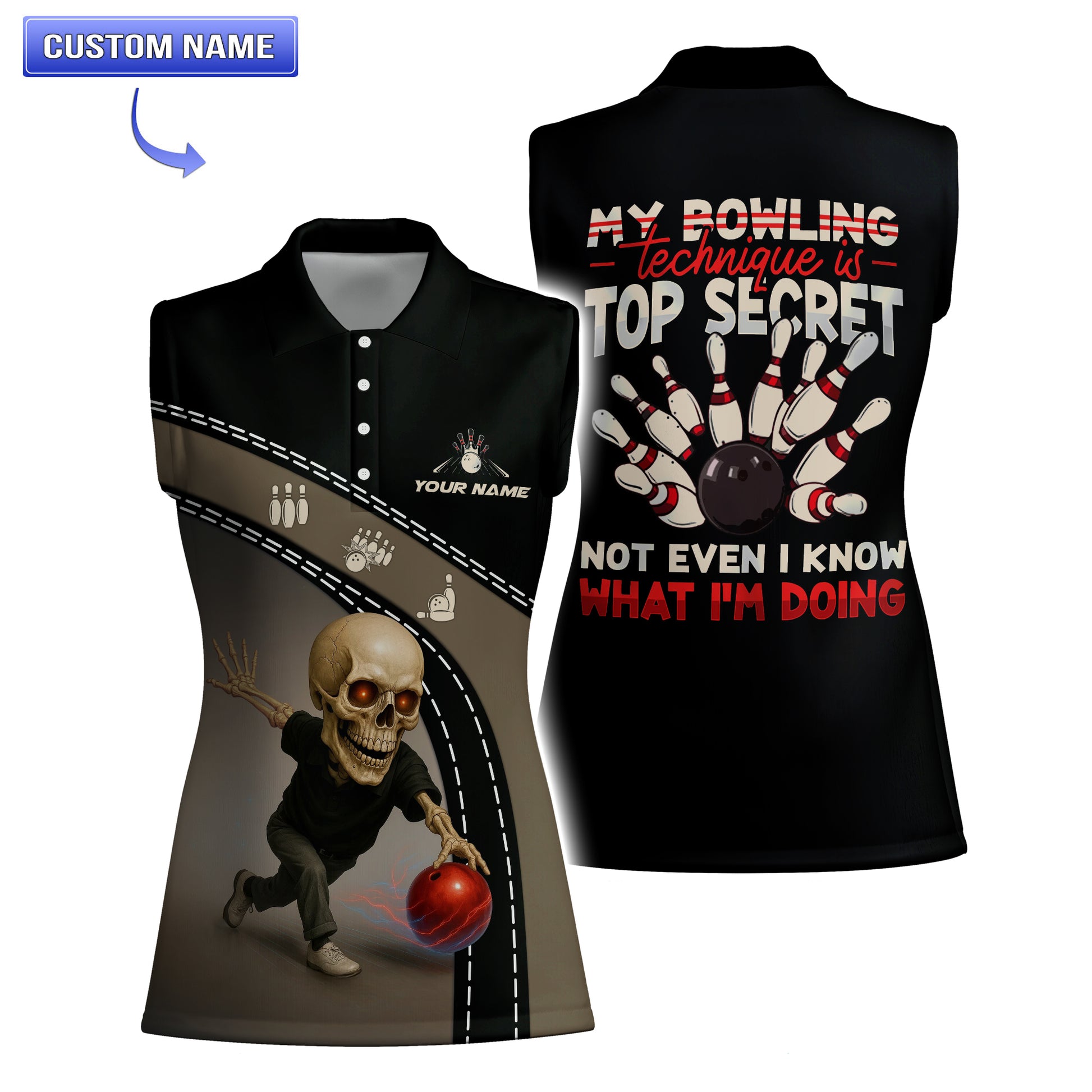 Funny Skull Bowling Polo Shirt – “My Bowling Technique Is Top Secret” Custom Name Shirt – Team Bowling Apparel for League & Tournament Players