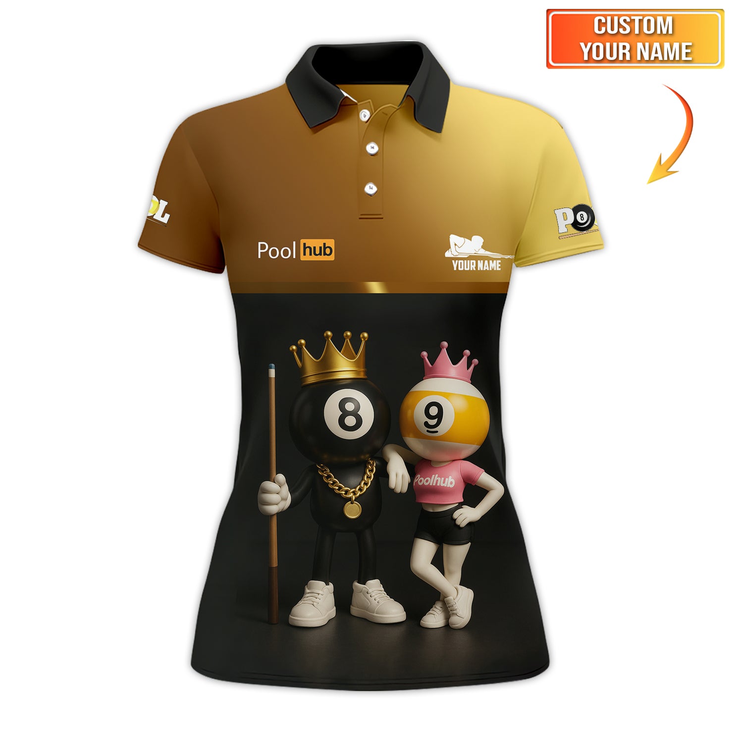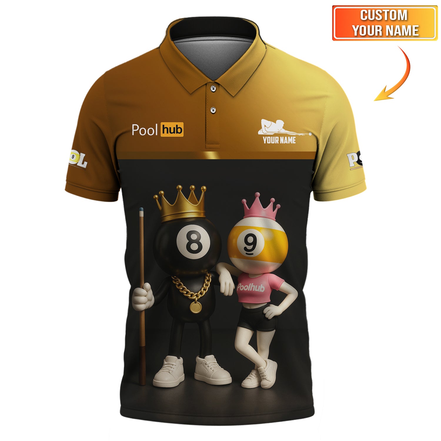 Elevate your game-day style with the PoolHub Royal 8 & 9 Billiard Graphic Shirt Collection. Each piece features vibrant 3D King 8-ball and Queen 9-ball characters wearing crowns against a sleek black-and-gold backdrop, accented with subtle PoolHub logos. Choose from short-sleeve tees, long-sleeve tees, long-sleeve polos, sleeveless polos, and women’s cuts—each fully customizable with your name printed beside the billiard silhouette. Crafted from soft, moisture-wicking performance fabric, these shirts deliver both comfort and standout visuals for any pool enthusiast.