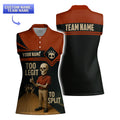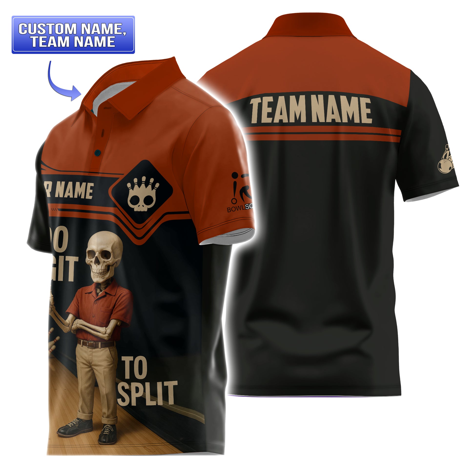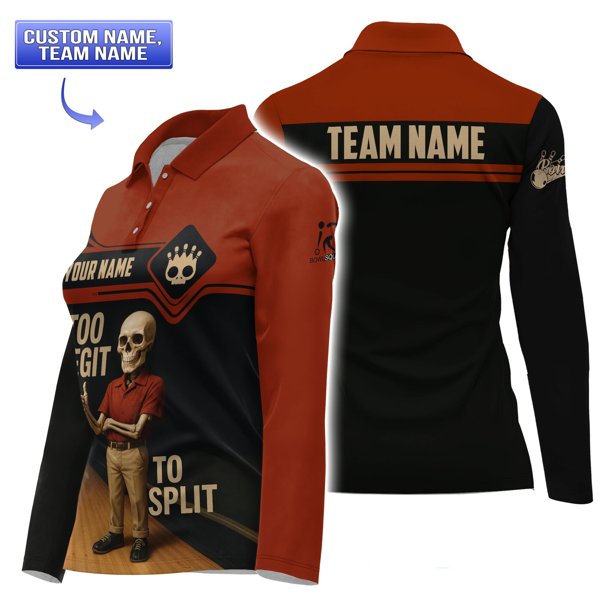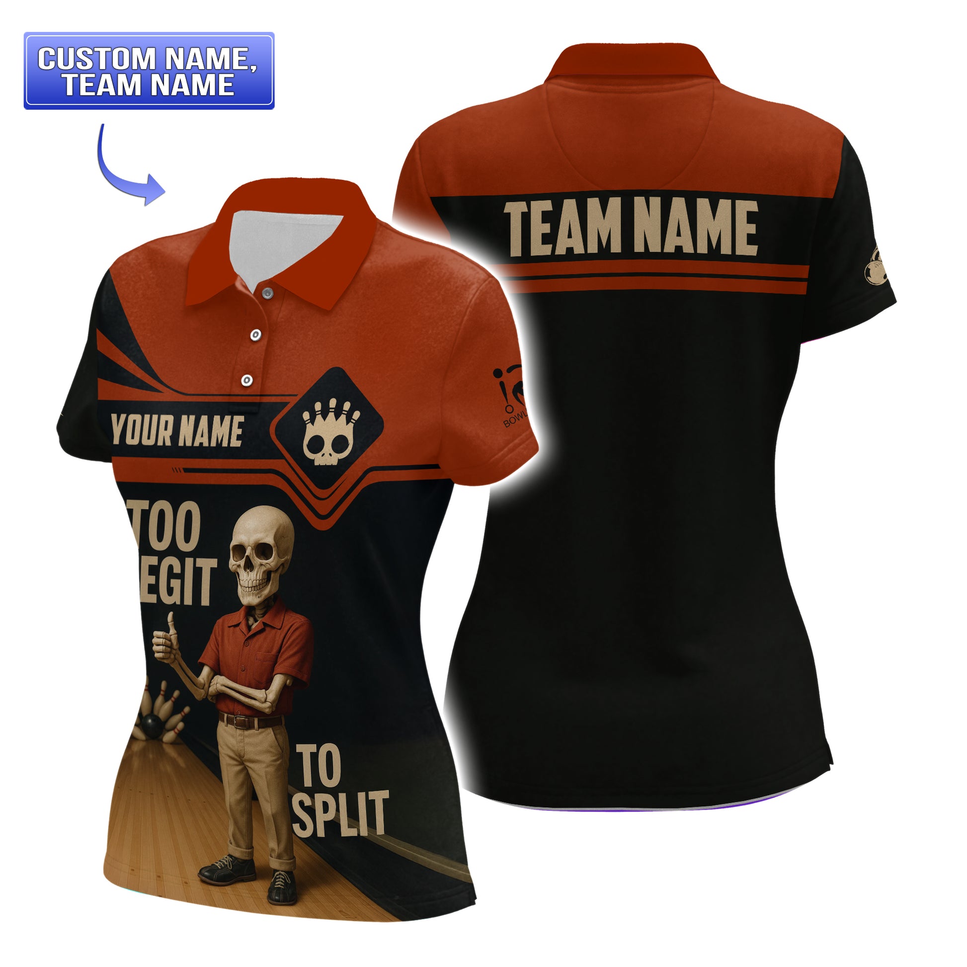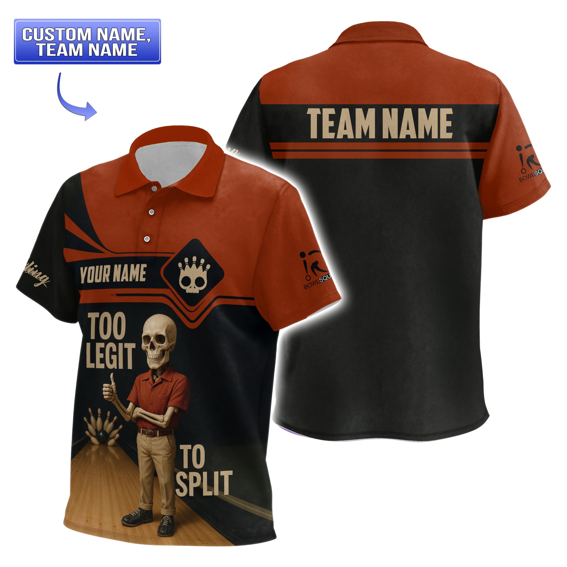 A full-bleed retro skeleton bowler in vintage red polo grips a glossy bowling ball against the dark wood lanes backdrop “Too Legit to Split” arcs across the lower front in bold tan lettering Custom name appears on the black chest stripe while “Team Name” spans the red yoke on the back Stylized skull-pin logo and miniature bowling pins accent the sleeve and chest for a playful club vibe The moisture-wicking polo blend and classic collar finish make this men’s bowling shirt as comfortable as it is eye-catchingly fun.